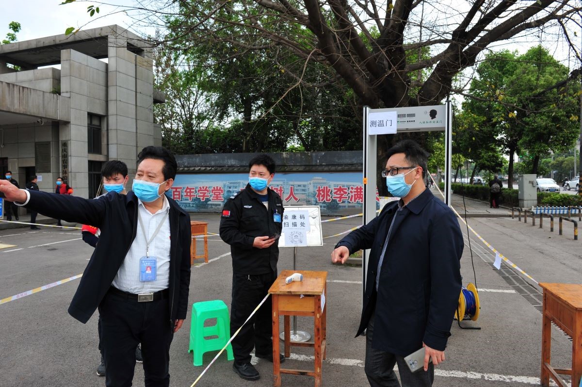 4月7日下午2时许,全体在校教职员工到学校校门口集结,开始开学入校演练,整个演练过程分为身份核对、渝康码检查、体温检测、进入通道消毒4个环节,由教职员工扮演“学生”模拟着正式开学时学生入校情景。