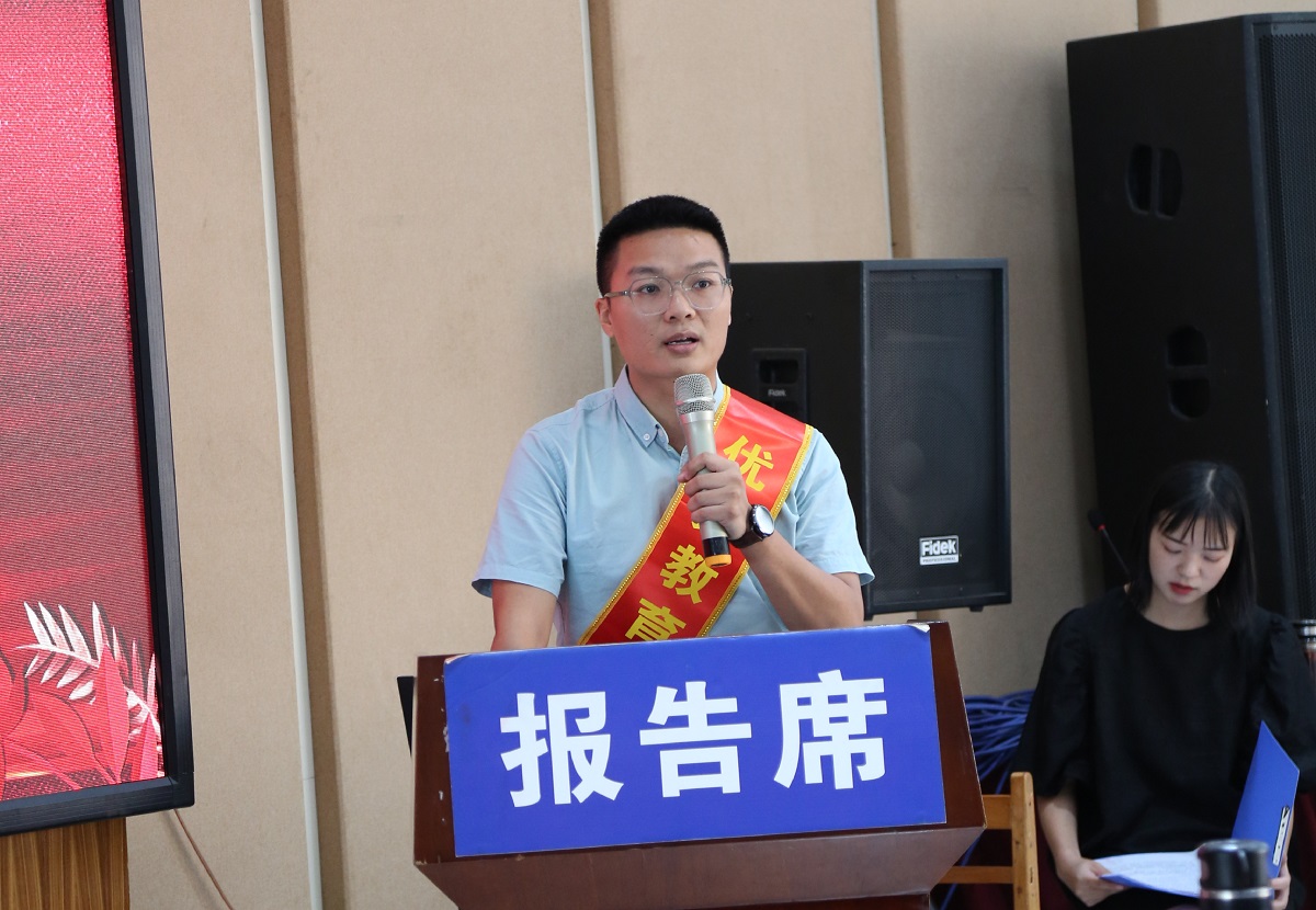 会上,优秀教育工作者代表张国远老师发言,他分享了自己成为教师的经验与感悟。他说:“我相信,在学校领导班子的正确领导下,通过骨干老师们的言传身教,以你们深厚的涵养、丰富的知识,一定会促使我们迅速成长,今天,我们是一棵棵教坛新苗,明天我们一定会长成参天大树。希望接下来,我们能够做得更加精彩和出色。”