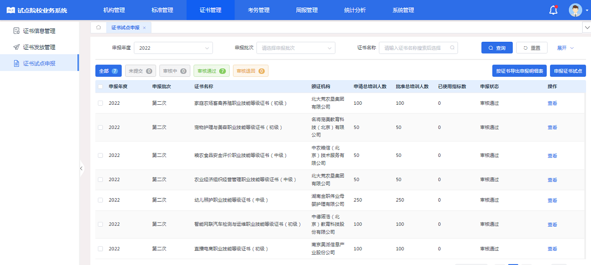 按照《重庆市教育委员会关于开展2022年1+X证书制度试点申报工作的通知》要求,学校高度重视,继续教育与培训部及各系部结合学校实际和专业建设特点,积极对接评价组织,深入了解证书内涵、职业技能等级标准、培训考核条件建设要求等,认真评估开展证书试点的工作基础,制定切实可行的实施方案。据教育部职业技能等级证书信息管理平台显示,星空体育网页版的证书试点申请(7项证书)已全部审批完成,申请总培训人数700人。
