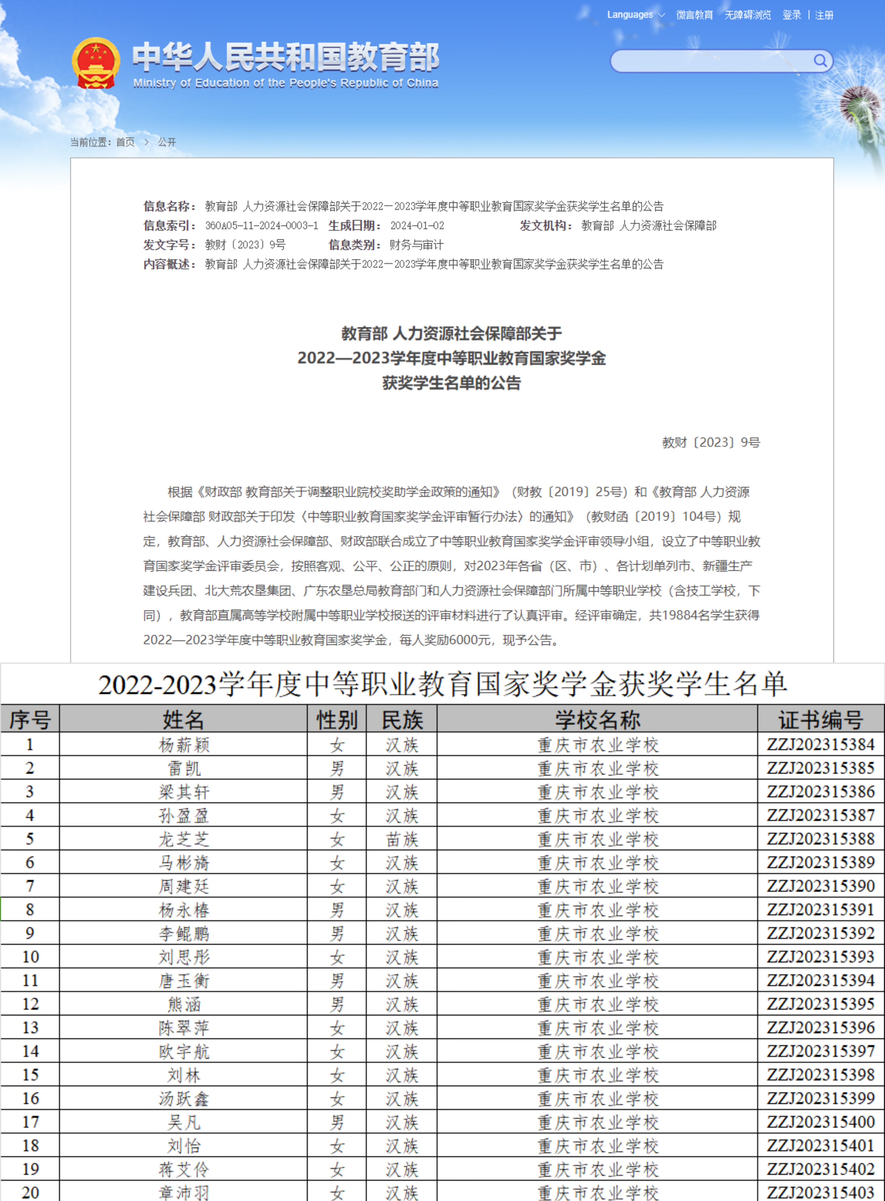 星空体育网页版2022-2023学年度中职国家奖学金获奖学生名单