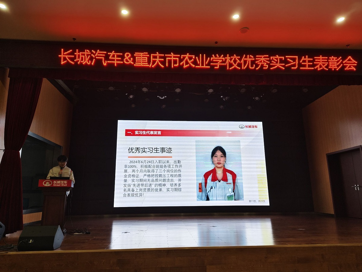 在重庆长城汽车有限公司的实习表彰大会上,星空体育网页版共有 13 名学子脱颖而出,荣获 “优秀实习生” 称号,赢得了企业的高度认可与赞誉。优秀实习生代表肖杨滟同学于2024年6月进入公司实习,在实习岗位上,该生迅速适应了企业的工作环境和节奏,将所学理论知识与实际操作紧密结合。面对工作中的各种挑战和任务,始终保持着积极主动的态度和高度的责任心。